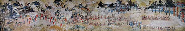 天贶殿内北、东和西三面墙壁上绘有巨幅《泰山神启跸回銮图》。 壁画高3米多,长有62米。“启”是出发,“跸”是清道静街,亦作 停留意,“回銮”是返回之意。描绘了泰山神出巡的浩荡壮观的场面。 画中人马,千姿百态,造型生动逼真。是泰山人文景观之一绝。