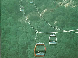 ③ 桃花源索道专为高空观景设计,载人车厢四面透明,紧凑小巧只能乘坐六人。端坐在空中俯瞰下界,山峰、沟壑、森林、盘道、游人历历在目,飞鸟从身旁掠过,浮云在脚下缭绕。此时的感觉是:只恨索道短,睹不能从容。因此建议你打算乘索道登泰山时,首先考虑这一条。